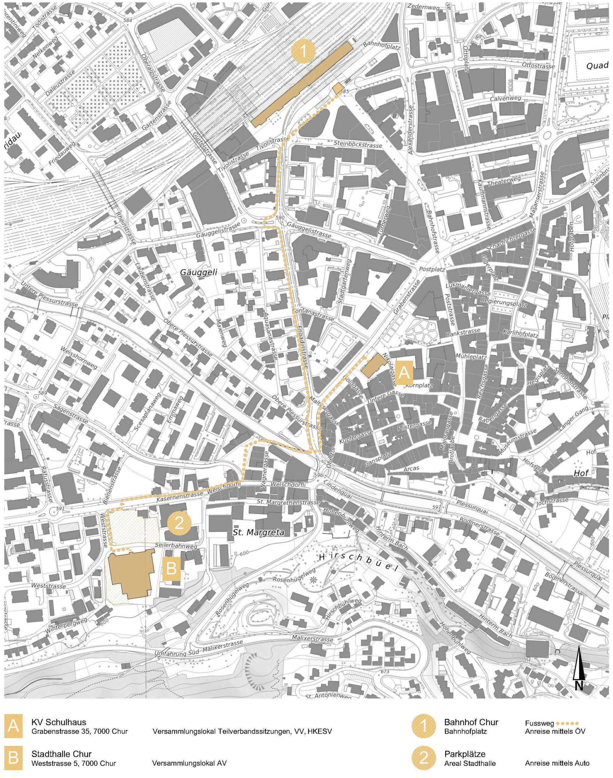 Coire est facilement accessible en train : depuis Berne (env. 2h30) et depuis Zürich HB (IC toutes les demi-heures, env. 1h15). La salle des fêtes se trouve à environ 15 minutes à pied de la gare (1,1 km) – voir le plan de situation pour plus de détails. La salle des fêtes est également accessible avec le bus urbain no 10, 11 ou 12, arrêt Brambrüeschbahn/Stadthalle.